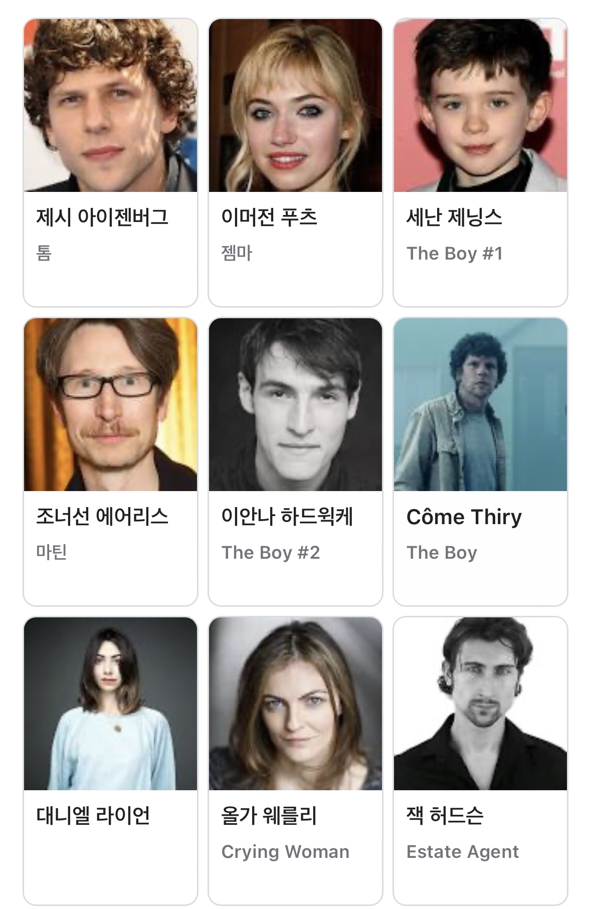 출연진 : 이모겐 푸츠(Imogen Gay Poots), 제시 아이젠버그(Jesse Eisenberg) 등